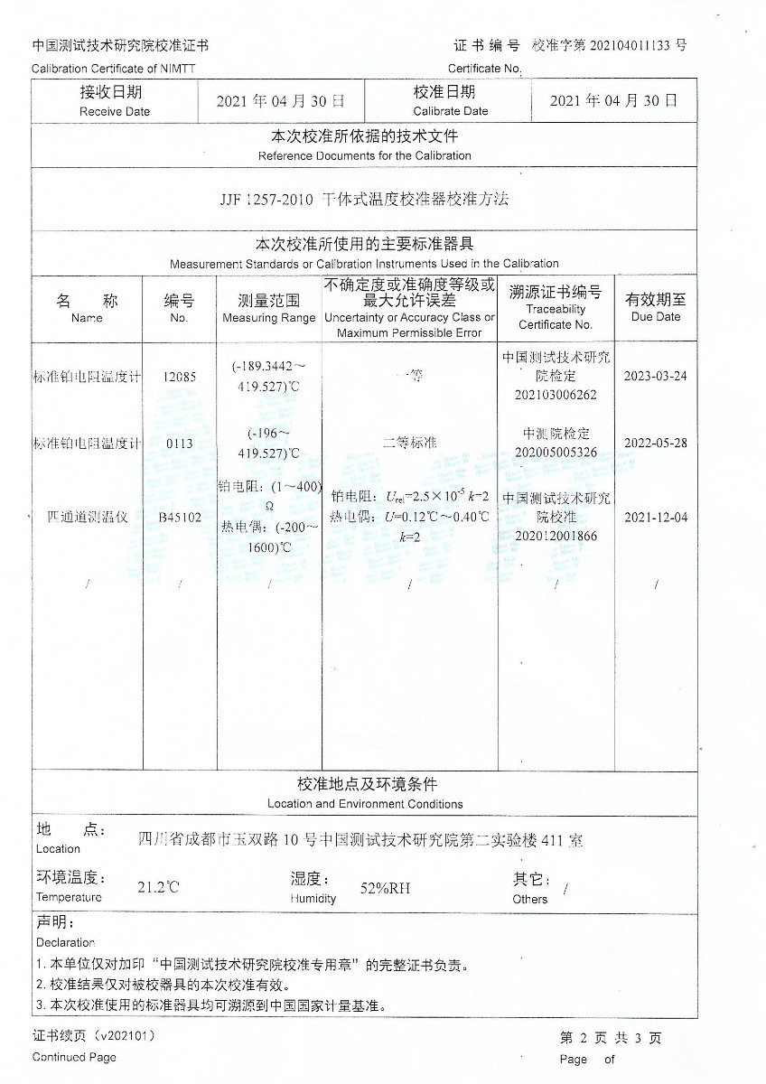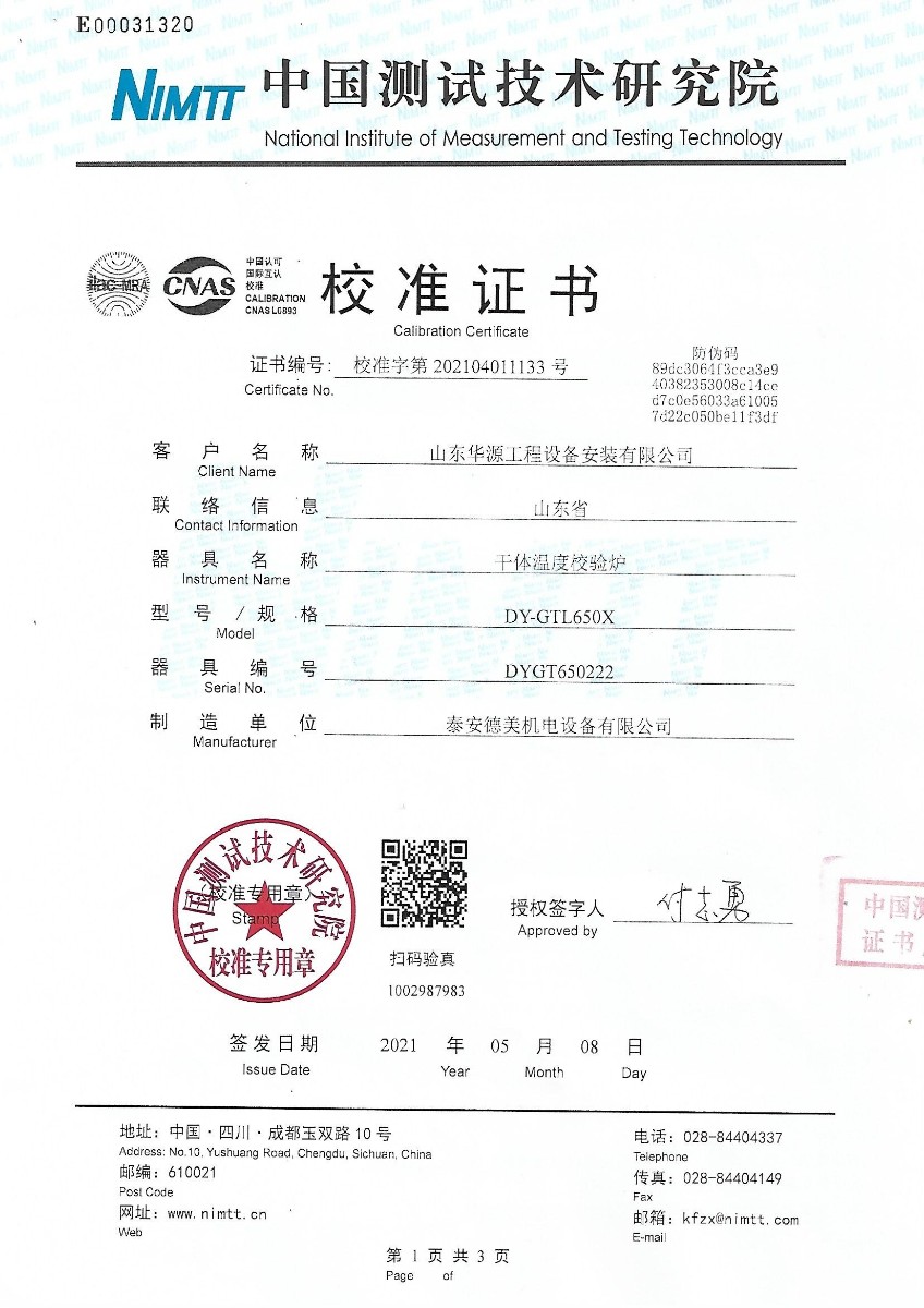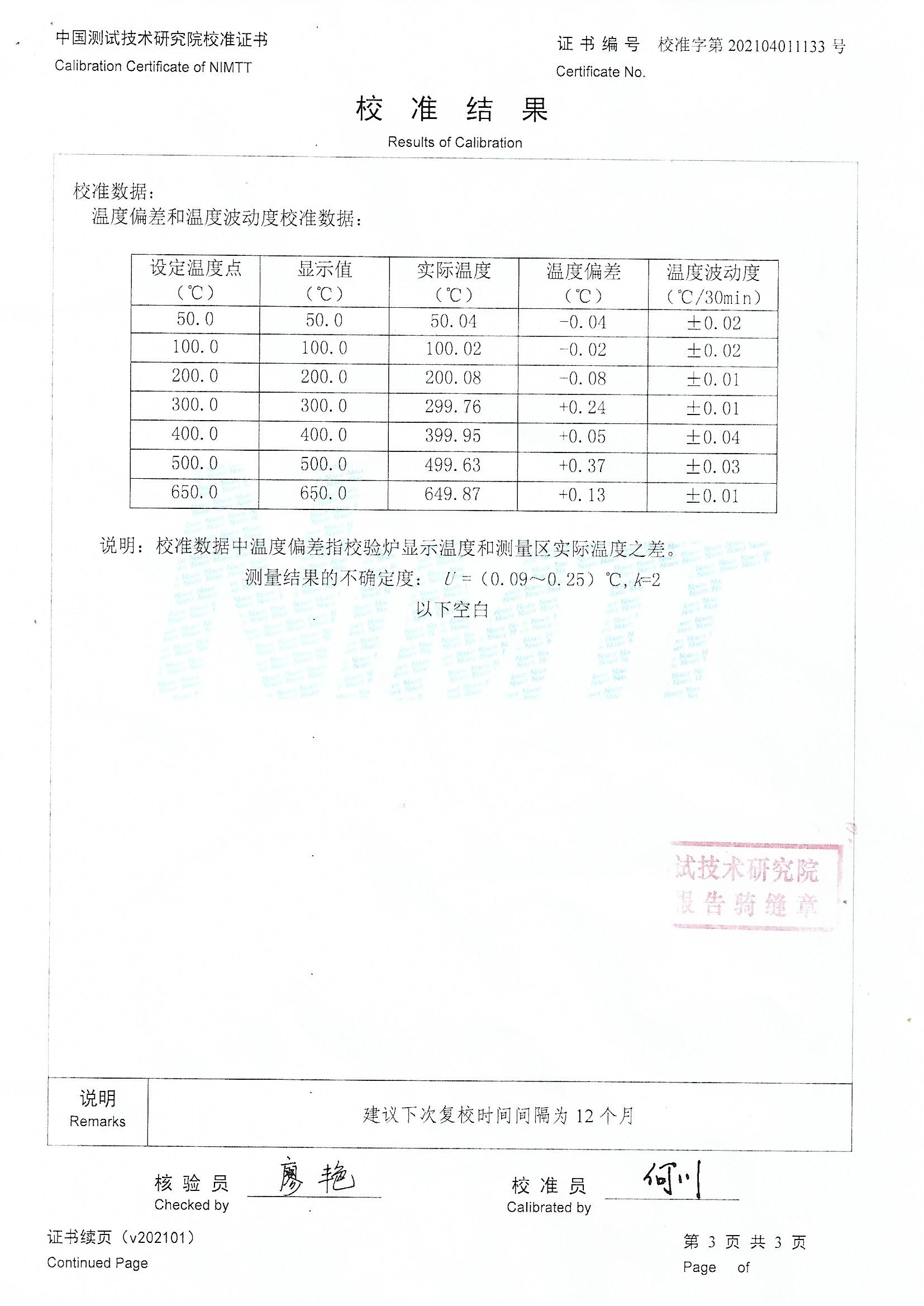 | 上一條:馬鞍山科思化學(xué)有限公司-干體溫度校驗爐 | 下一條:智能干體儀(六位半精度)校準(zhǔn)證書 |