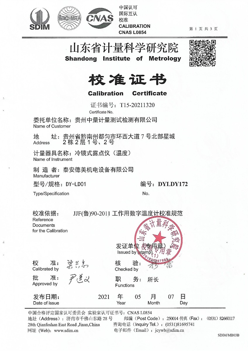 貴州中量計量測試檢測有限公司-冷鏡式露點儀校準證書 2021-5-15 本文被閱讀 15296 次