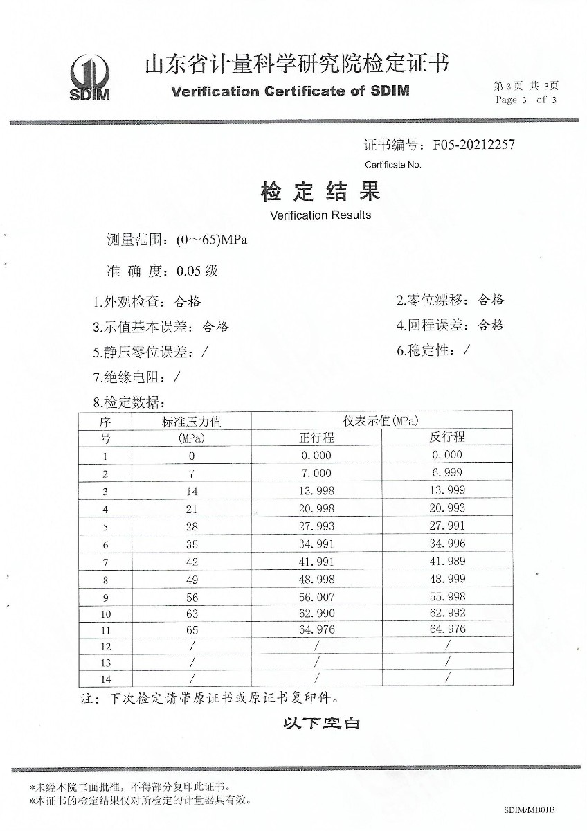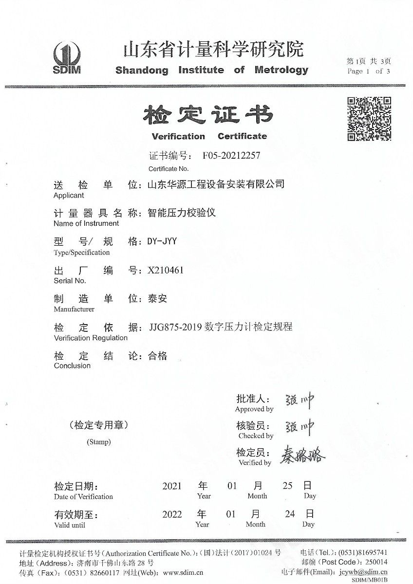 | 上一條:山東華源工程設(shè)備安裝有限公司-智能壓力校驗儀X210460 | 下一條:智能干體儀(六位半精度)校準證書 |