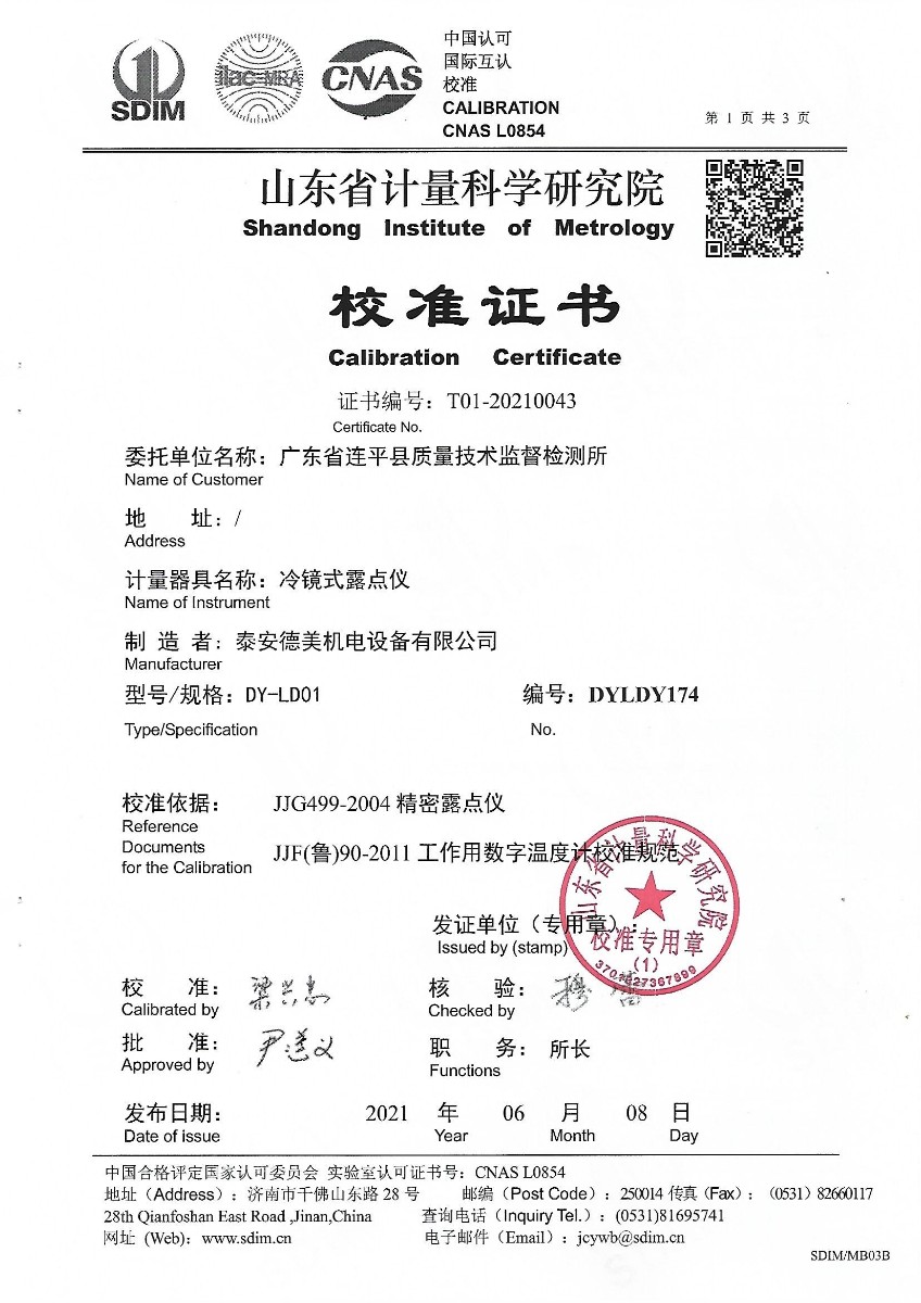 廣東省連平縣質(zhì)量技術(shù)監(jiān)督檢測所-冷鏡式露點儀 2021-6-10 本文被閱讀 15263 次