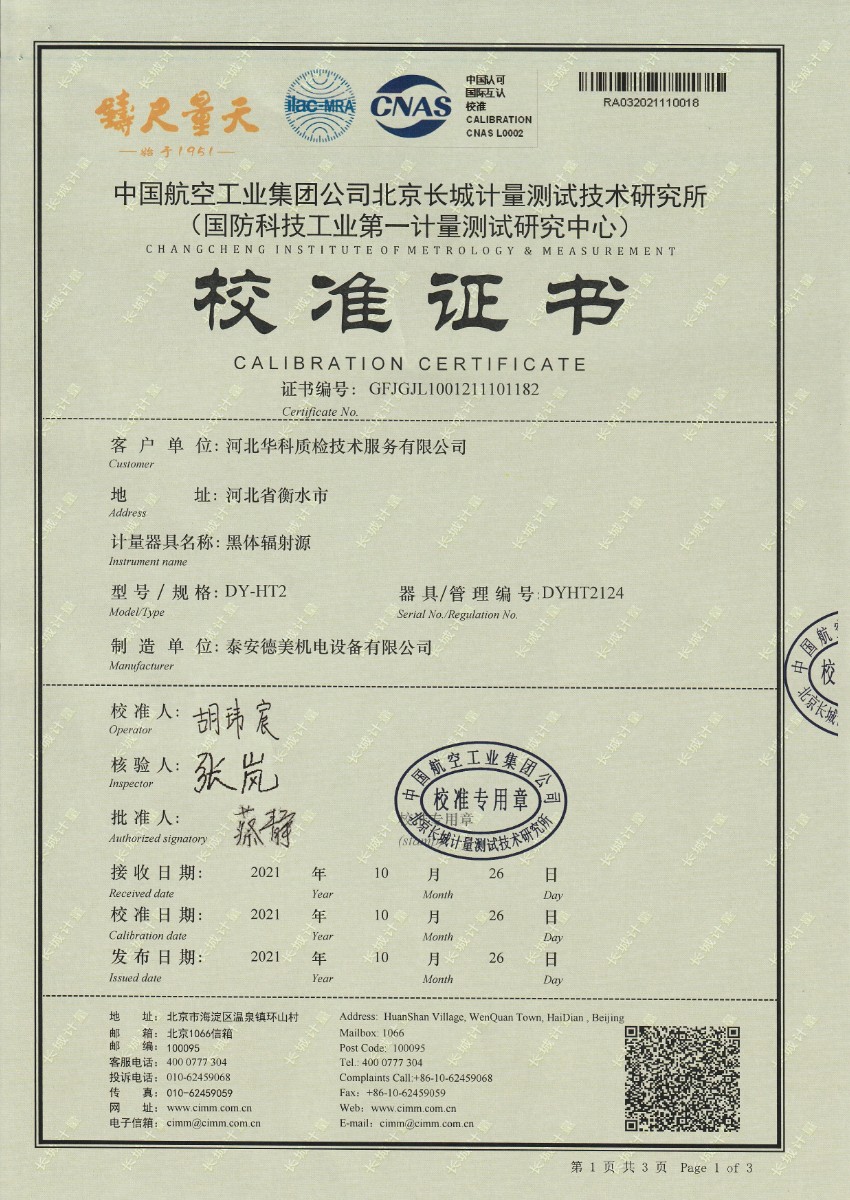 | 上一條:河北華科質(zhì)檢技術(shù)服務(wù)有限公司-黑體輻射源(DY-HT1) | 下一條:智能干體儀(六位半精度)校準(zhǔn)證書 |