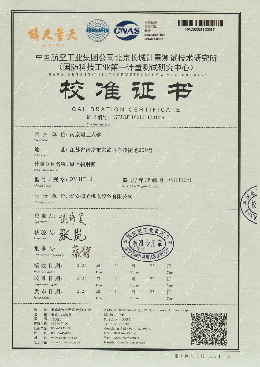 南京理工大學(xué)-黑體輻射源校準證書25℃ 2021-12-4 本文被閱讀 16024 次