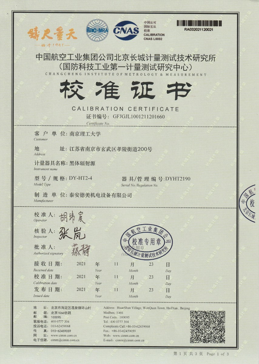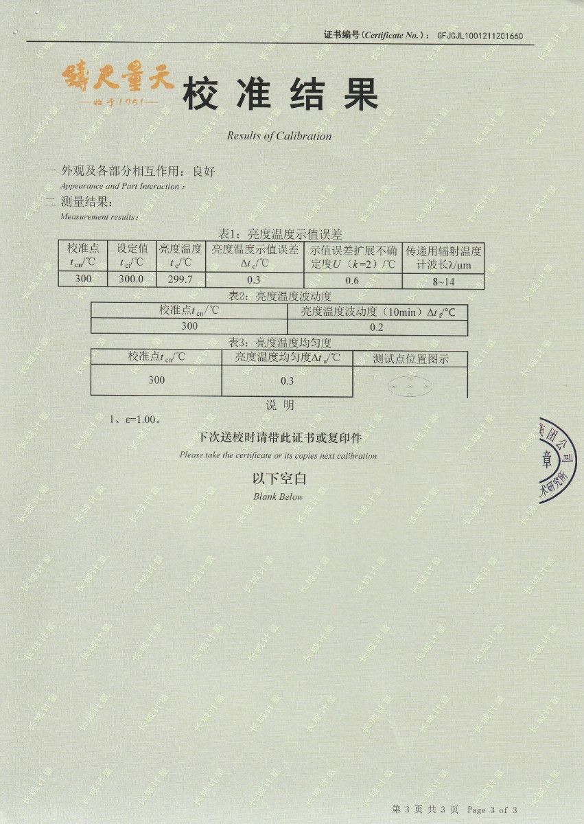 | 上一條:南京理工大學(xué)-黑體輻射源校準(zhǔn)證書180-500℃ | 下一條:智能干體儀(六位半精度)校準(zhǔn)證書 |