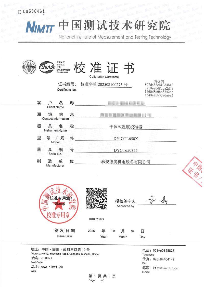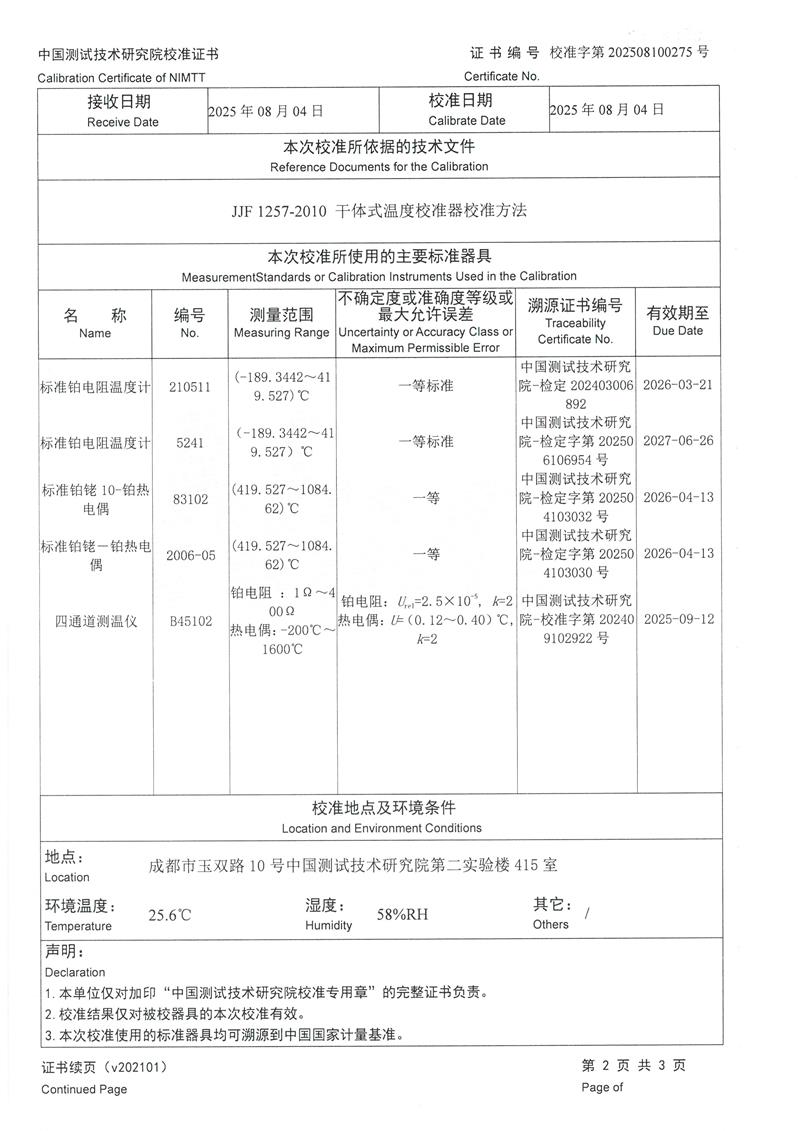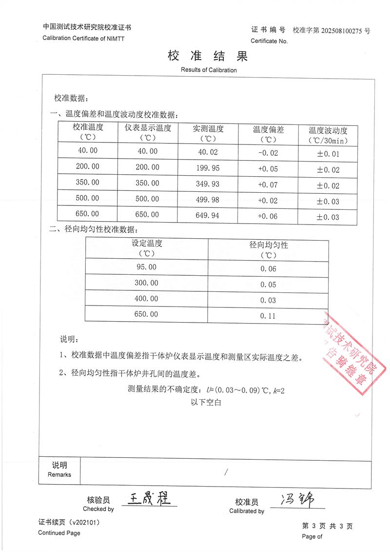 干體式溫度校準(zhǔn)器(40~650℃)校準(zhǔn)證書(shū) 2025-8-6 本文被閱讀 2259 次