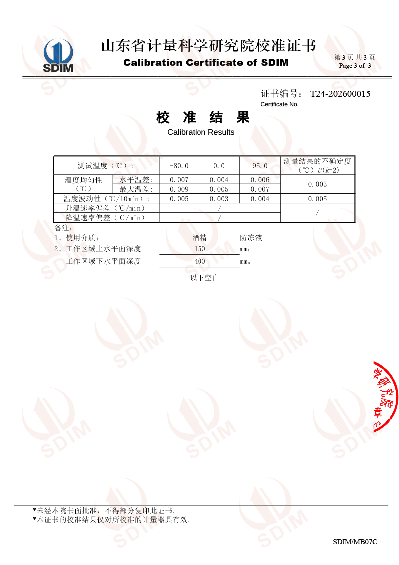 | 上一條:高精度制冷恒溫槽(-30~95℃)校準(zhǔn)證書 | 下一條:水三相點瓶凍制與保存裝置校準(zhǔn)證書 |