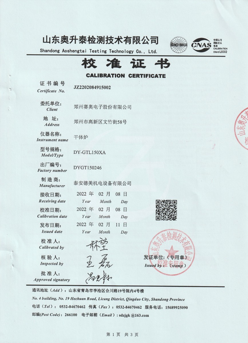 上一條:鄭州賽奧電子股份有限公司-干體爐DYGT150245下一條:智能干體儀(六位半精度)校準(zhǔn)證書
