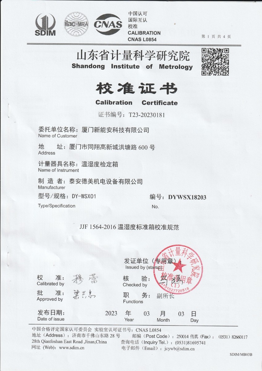 廈門新能安科技有限公司 溫濕度檢定箱 校準(zhǔn)證書 2023-3-13 本文被閱讀 11566 次