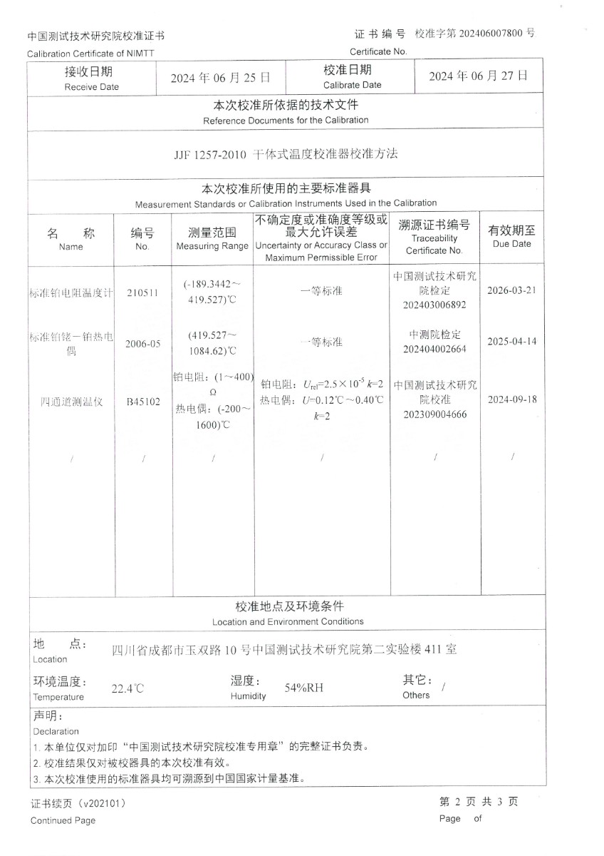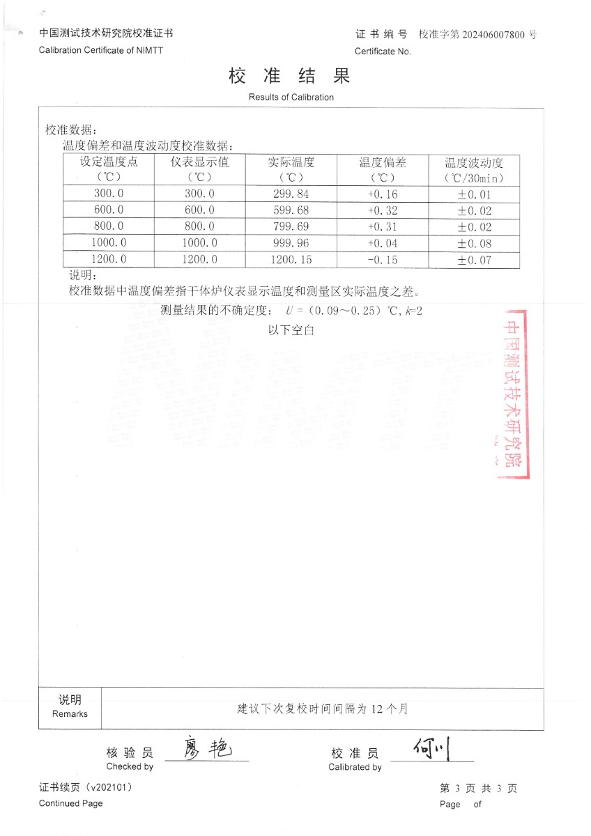 高溫干體爐(300~1200℃)校準(zhǔn)證書 2024-7-1 本文被閱讀 6077 次