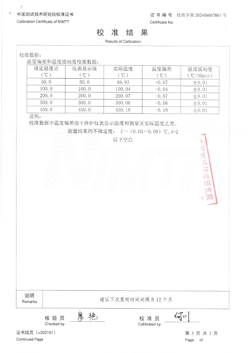 中溫干體爐(50~450℃)校準(zhǔn)證書 2024-7-1 本文被閱讀 6244 次