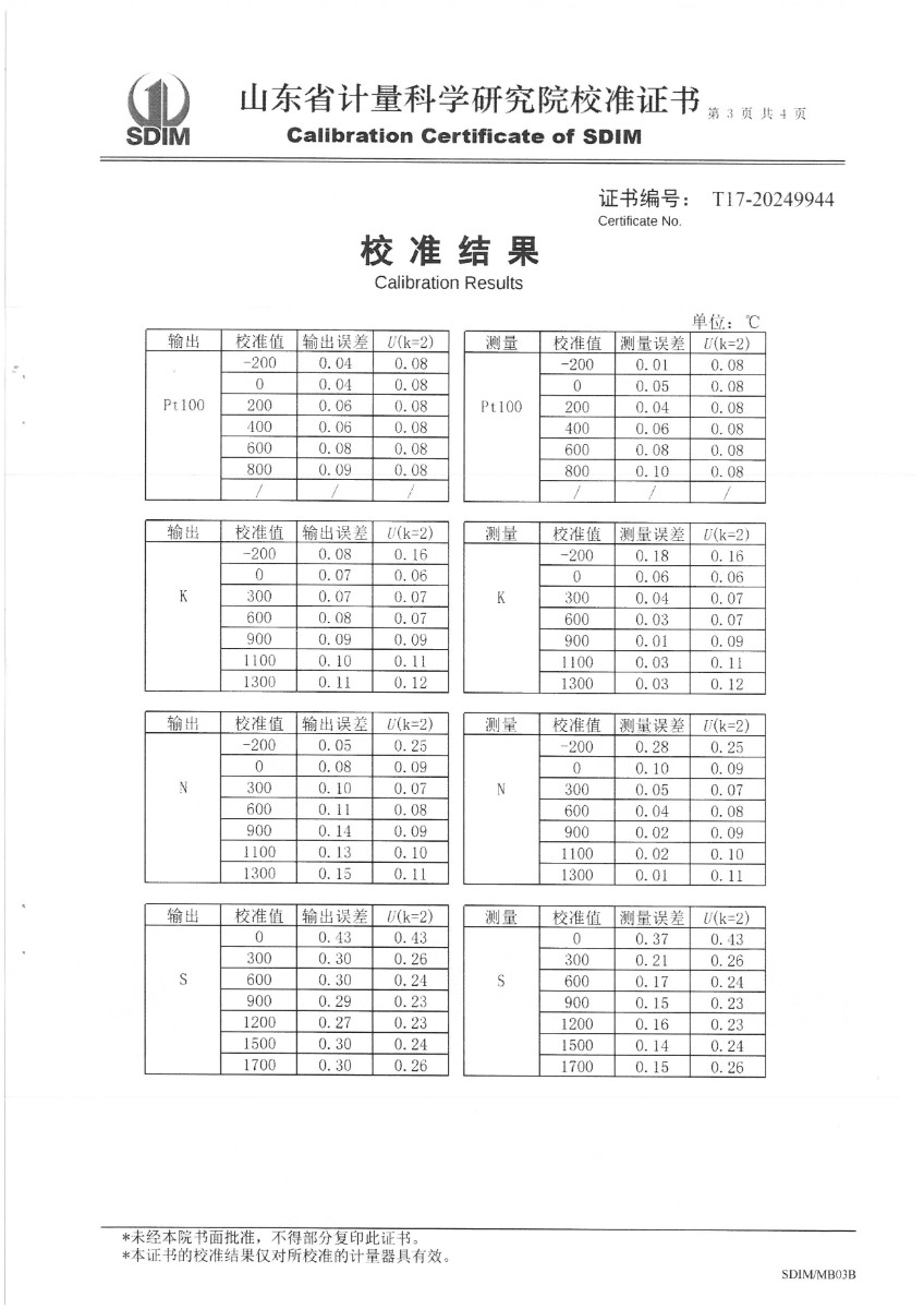 便攜式過(guò)程校驗(yàn)儀(-200~1800℃)校準(zhǔn)證書(shū)
