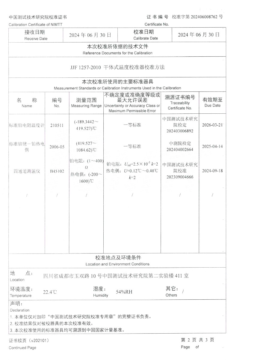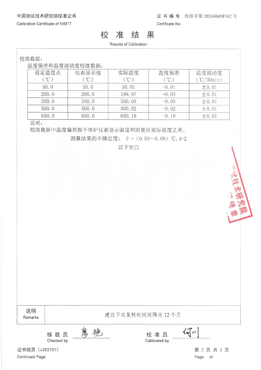 | 上一條:中溫干體爐295(50~650℃)校準(zhǔn)證書 | 下一條:智能干體儀(六位半精度)校準(zhǔn)證書 |