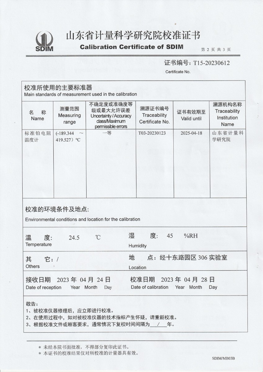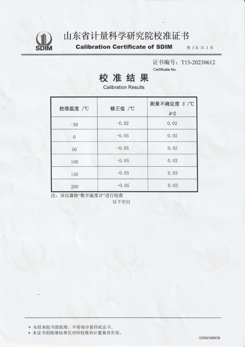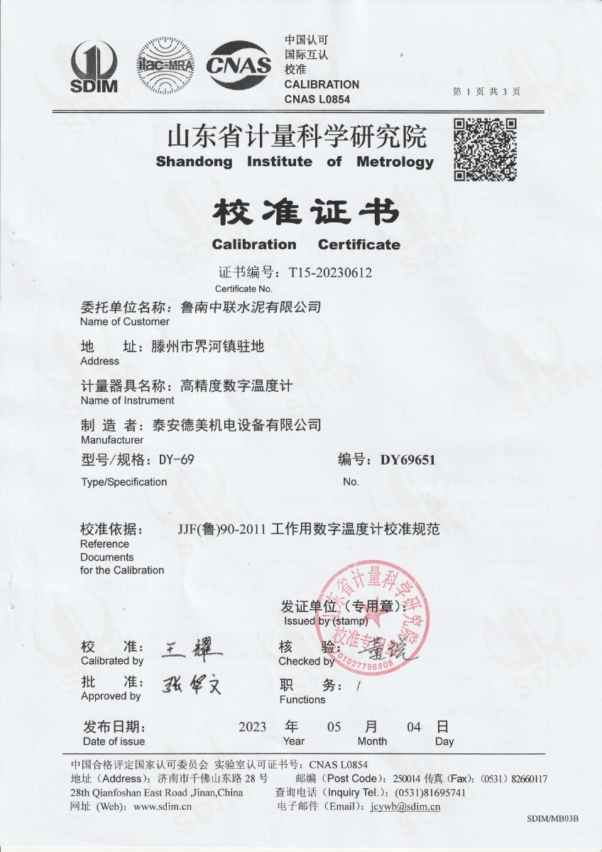 魯南中聯(lián)水泥有限公司 高精度數(shù)字溫度計(jì) 校準(zhǔn)證書 2023-5-18 本文被閱讀 11379 次