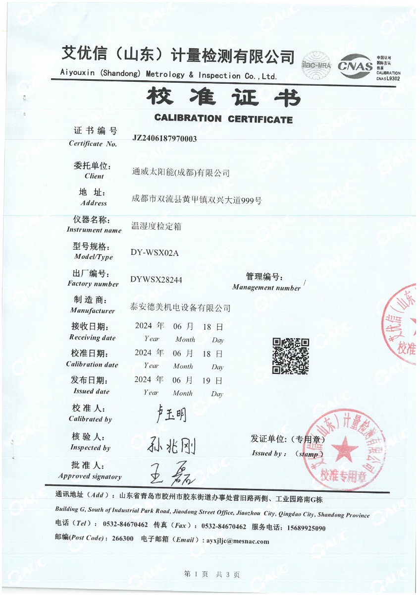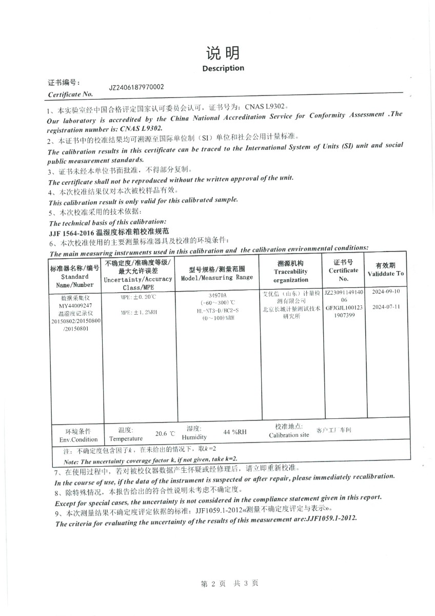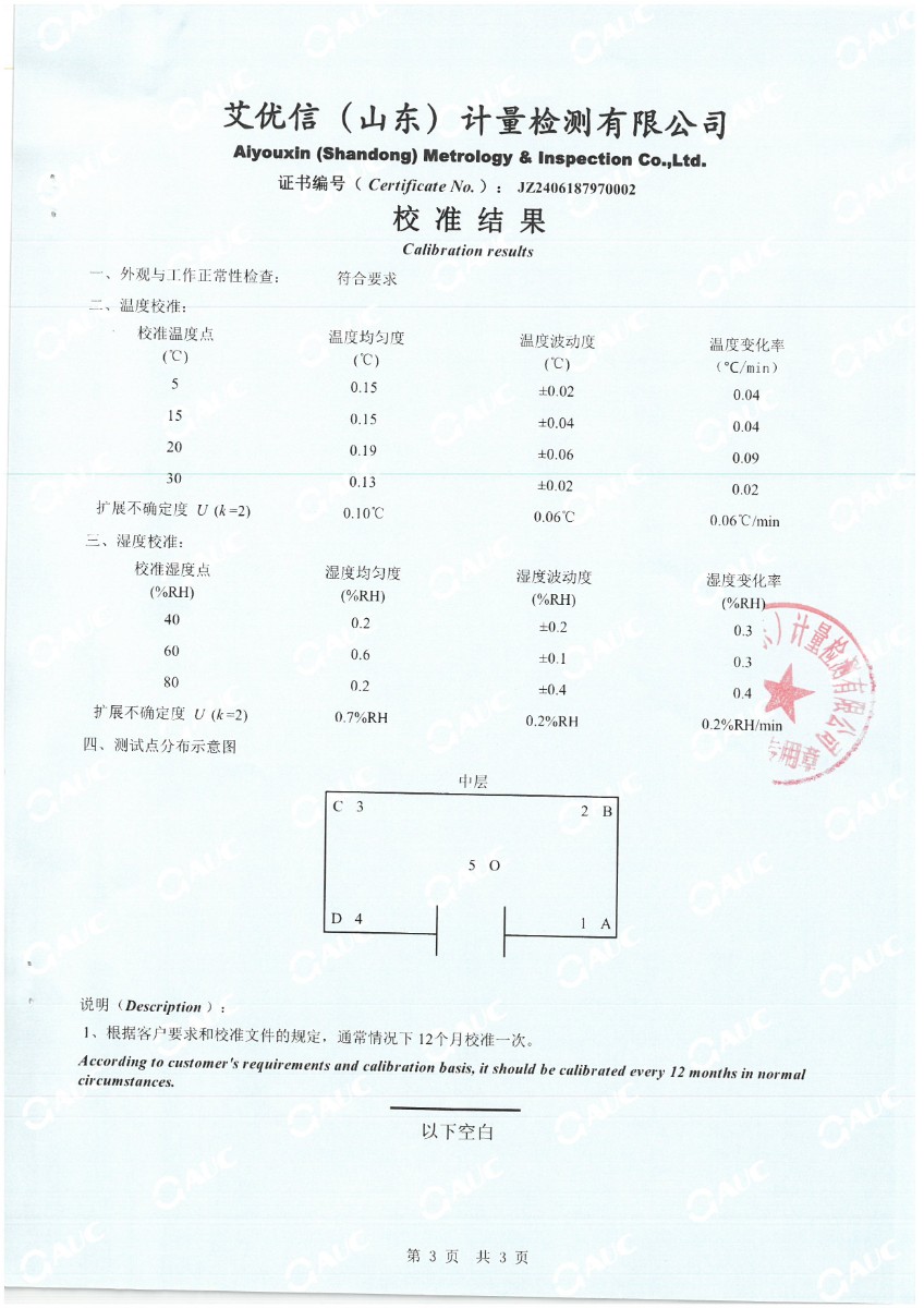 溫濕度檢定箱(-10~65℃)校準證書 2024-6-25 本文被閱讀 6267 次