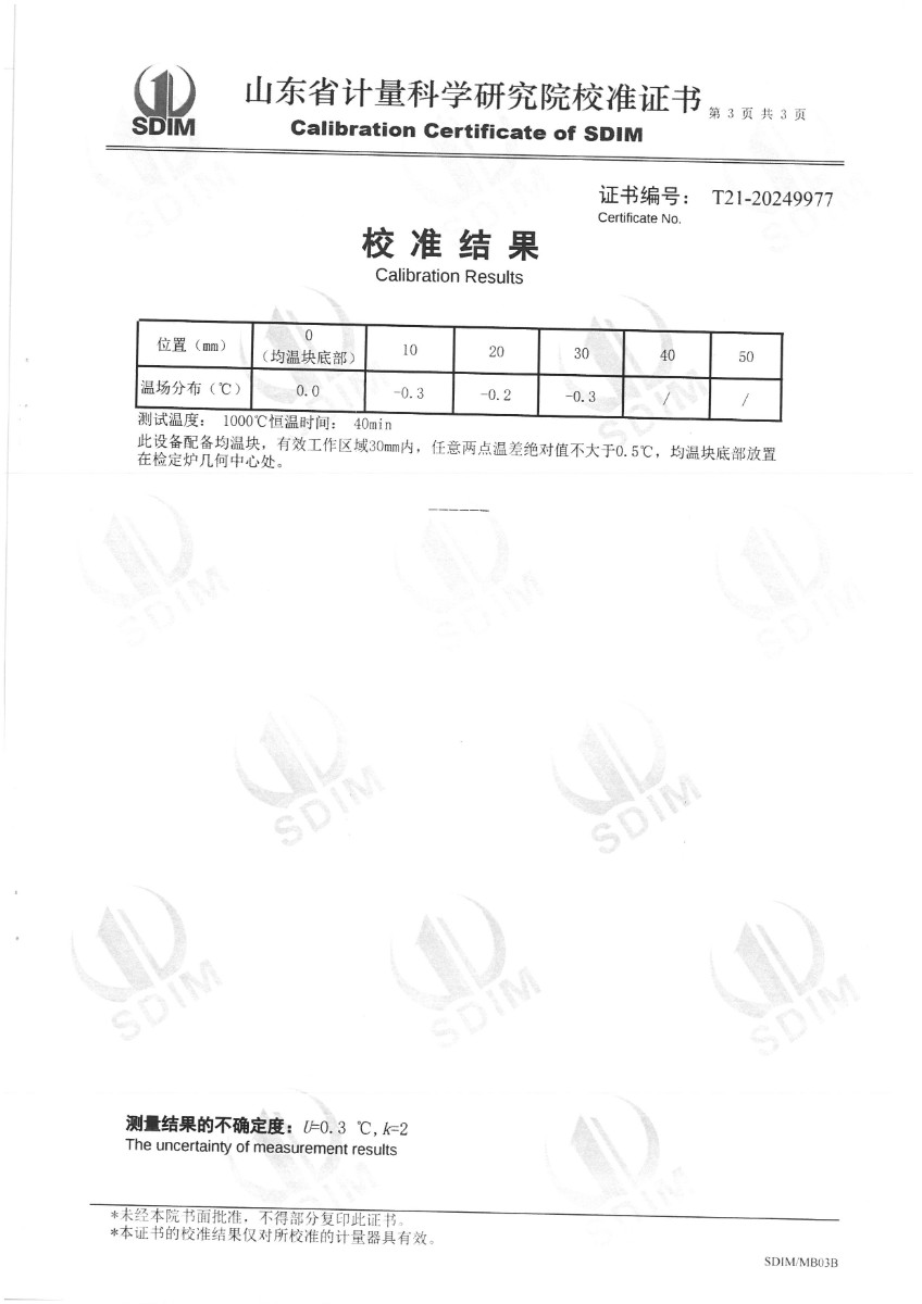 廉金屬熱電偶檢定爐(300~1200℃)校準(zhǔn)證書